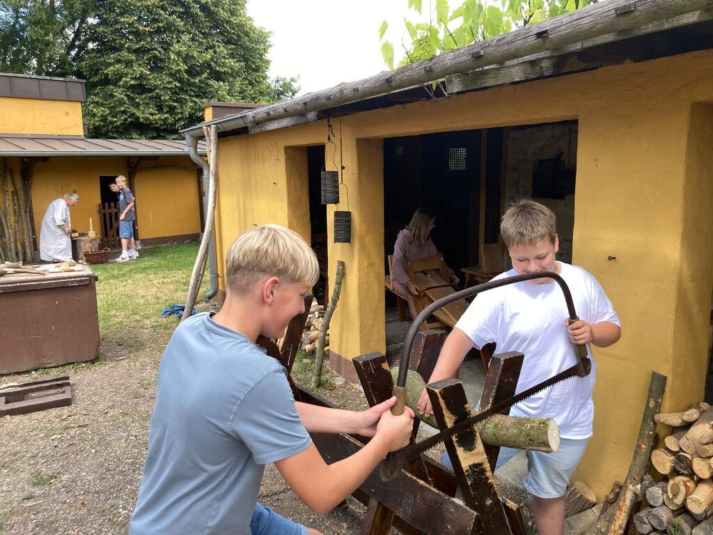 In verschiedenen Mitmachstationen konnten die Schülerinne und Schüler selbst tätig werden: Es wurde Kräutersalz hergestellt, eigene Hämmer 🔨und Holzdübel gefertigt und Seile geflochten. An einer weiteren Station lernten sie, wie man mit einem traditionellen Mahlstein eigenständig Mehl herstellt – eine echte Gemeinschaftsleistung, bei der alle mit anpackten.