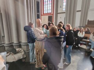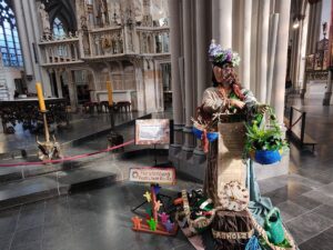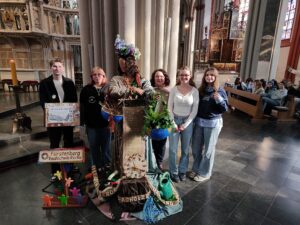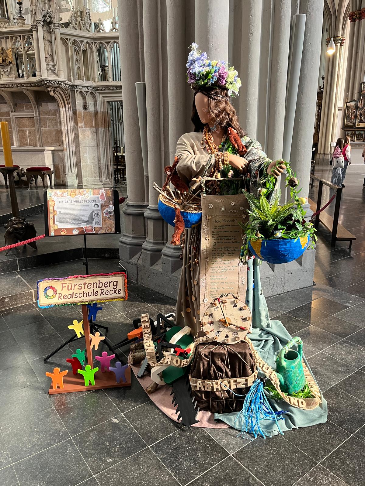 Gegen 10:00 Uhr sind wir in Xanten eingetroffen und wurden freundlich von den Schülerinnen der Marienschule zum Dom geleitet, wo wir unser Artobjekt an der Wal-Installation in der Altarnähe aufbauen könnten. Dem gemeinsamen Auftakt folgte ein spiritueller Impuls von Weihbischof Lohmann, der von Gebeten und Fürbitten der Realschülerinnen begleitet wurde. Wir haben uns auch auf die Gelegenheit gefreut, bei einem sonnigen Frühlingswetter die Innenstadt Xanten zu erkunden. Nach einem gastfreundlichen Mittagessen waren alle Teilnehmerinnen und Teilnehmer eingeladen, inhaltlich die Projekte der anderen 15 Schulen näher kennenzulernen. Ein besonderes Interesse fanden unseren Schülerinnen und Schüler am Projekt zu den Frauenrechten und einer blaubeleuchteten Installation, die den Meerestieren gewidmet wurde. Am schönsten fanden die Schülerinnen und Schüler aber unsere Mutter Erde.